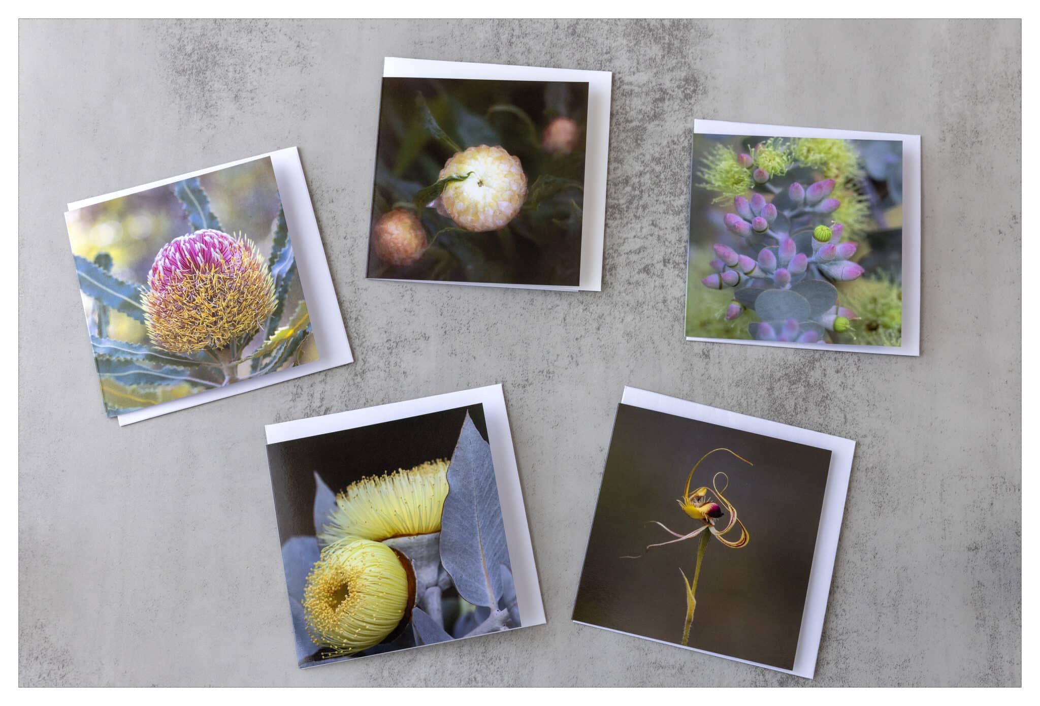 Five square greeting cards.